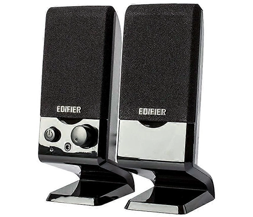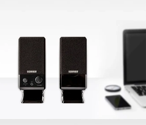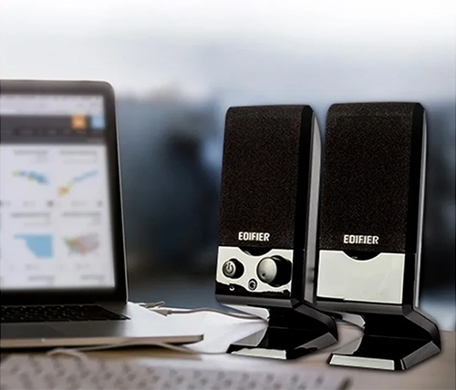 רמקולים שולחניים Edifier R10U בצבע שחור עם הפעלה פשוטה דרך USB ללא צורך בשקע נפרד או סוללות, חיבור AUX 3.5 מ"מ, יציאת אוזניות נוחה בחזית, ושליטה קלה בווליום קדמי