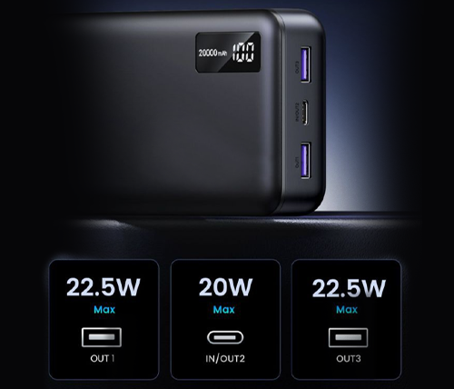 מצויד בשתי יציאות USB A בהספק 22.5W ויציאת USB C אחת בהספק 20W, סוללת גיבוי יכולה לטעון 3 מכשירים בו זמנית.