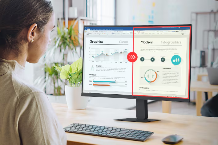 אפליקציית LG Switch מסייעת להתאים את המסך לסביבת עבודה יעילה – ניתן לחלק את התצוגה לשישה אזורים, לנהל לוחות זמנים ולהפעיל שיחות וידאו באמצעות מקשי קיצור.