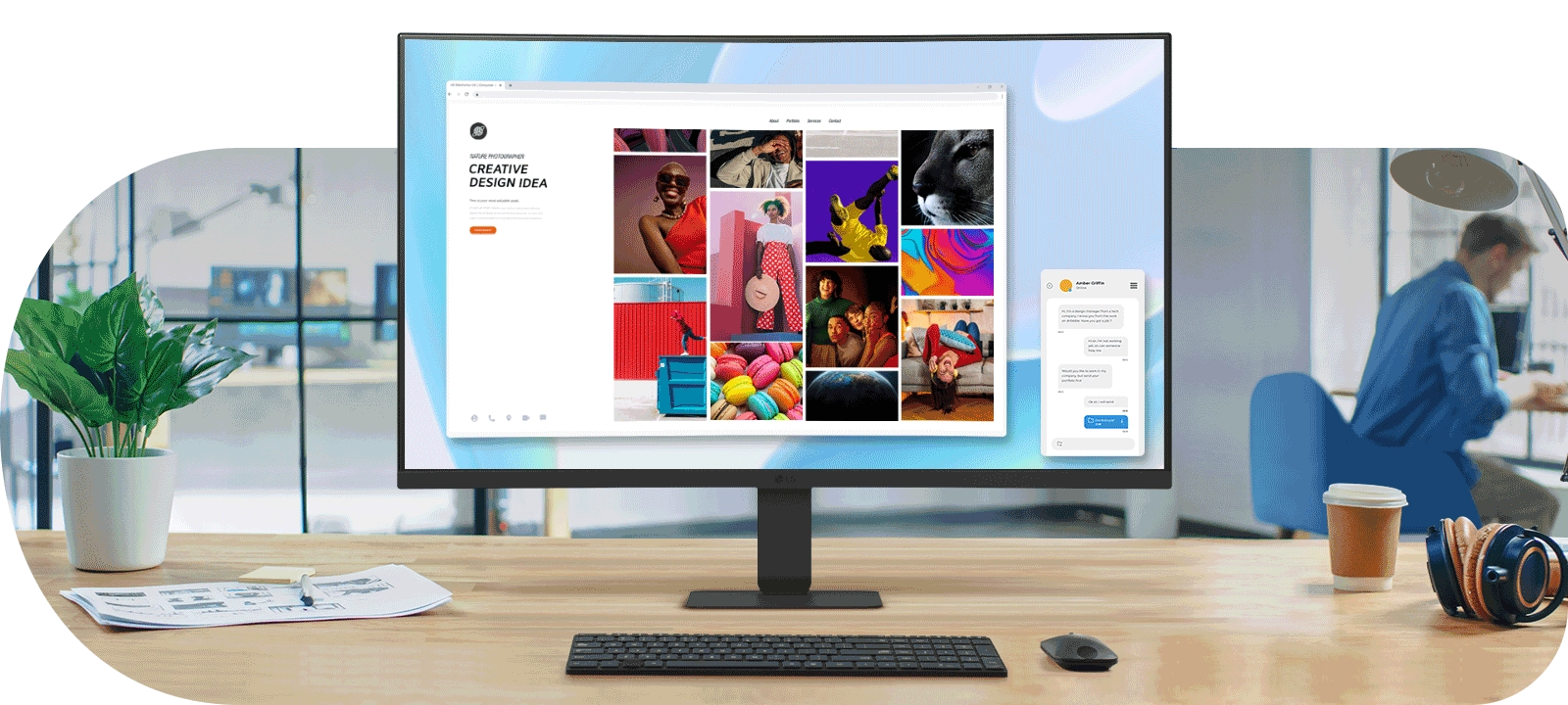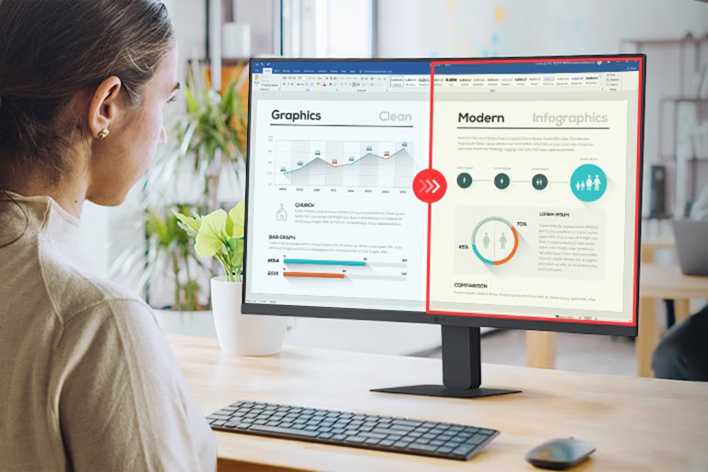 אפליקציית LG Switch מסייעת להתאים את המסך לסביבת עבודה יעילה – ניתן לחלק את התצוגה לשישה אזורים, לנהל לוחות זמנים ולהפעיל שיחות וידאו באמצעות מקשי קיצור.
