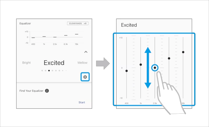 כיילו את הצליל לפי ההעדפה האישית שלכם. בחרו מתוך מגוון פריסטים לפי סגנון המוזיקה שאתם שומעים, או צרו פרופיל מותאם אישית דרך האקולייזר באפליקציית Sony | Sound Connect.
