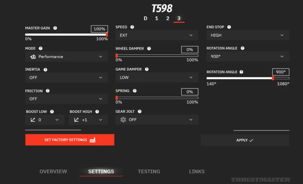 תוכנת My Thrustmaster Panel (למחשב) מאפשרת לך לכוונן בקלות את הגדרות ה-T598, לבדוק את תקינותו ולעדכן גרסה – כדי שתוכל להפיק את המרב בכל הקפה.