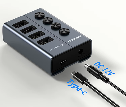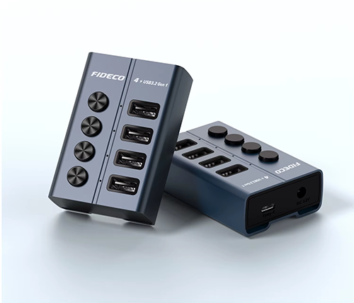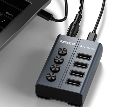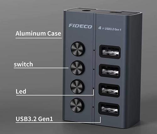מפצל USB 3.2 עם 4 יציאות - כולל ספק כח - עם מתגי הפעלה ליציאות - FIDECO HKG04