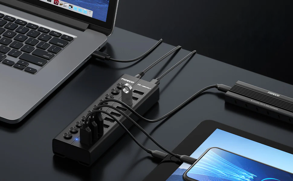 מפצל ה-USB של FIDECO מעניק לכם את החופש לחבר בקלות מגוון רחב של התקנים – עכברים, מקלדות, דיסקים חיצוניים, מדפסות ועוד – דרך חיבור אחד נוח.