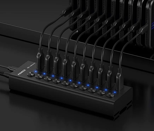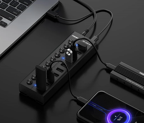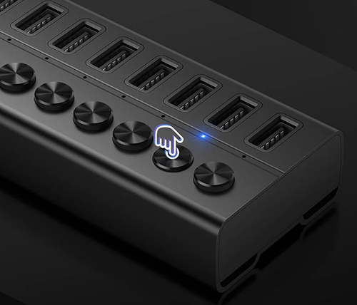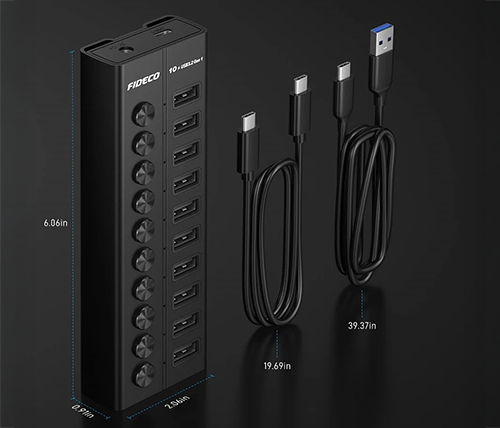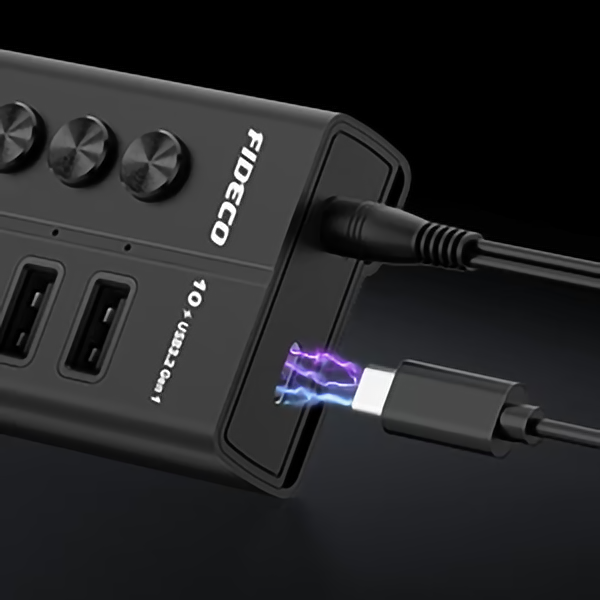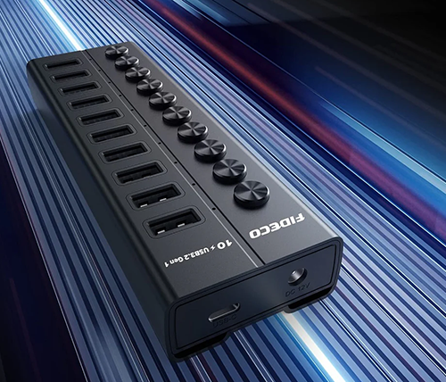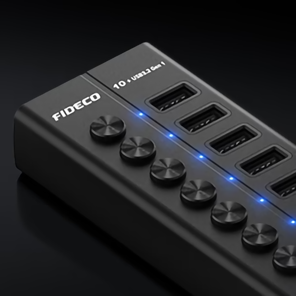מפצל USB 3.2 עם 10 יציאות - כולל ספק כח - עם מתגי הפעלה ליציאות - FIDECO HKG10
