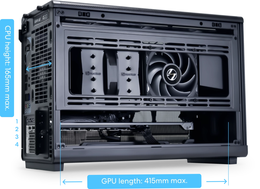 מארז ה־A3-mATX תומך בקירור למעבד בגובה מקסימלי של 165 מ"מ ובכרטיס מסך בעובי של 4 סלוטים ובאורך מקסימלי של 415 מ"מ. יש לשים לב: עם התקנת מאוורר בעובי 25 מ"מ בתחתית – עובי כרטיס המסך מוגבל ל־61 מ"מ, כך שתוכלו להתקין רק כרטיס בעובי 3 סלוטים. בנוסף, כאשר מתקינים רדיאטור בשילוב מאוורר – לא יישאר מקום עבור כרטיס מסך כלל.