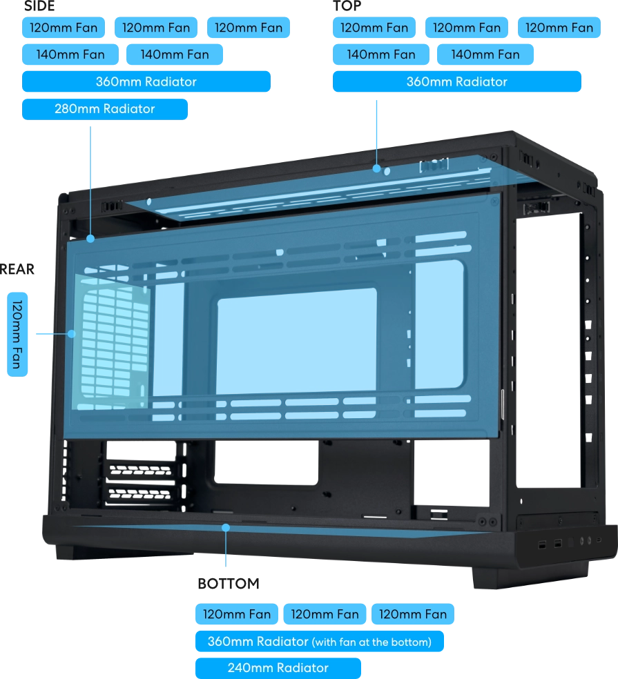 המארז בנפח 26.3 ליטר ממקסם את יכולות הקירור שלו, ומאפשר התקנת מערכת קירור מים (AIO) בגודל 360 מ"מ לקירור יעיל של הרכיבים.