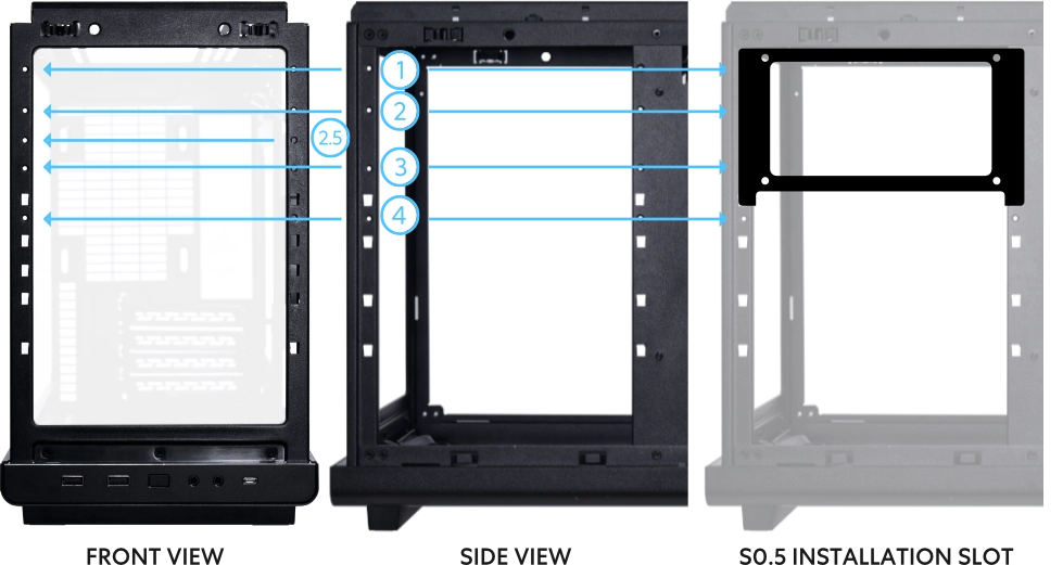 תומך בהתקנת ספק כוח ATX בחזית, באמצעות חיבורו למתקן ה־SSD בעזרת כלי מרווחים (Standoff Tool).