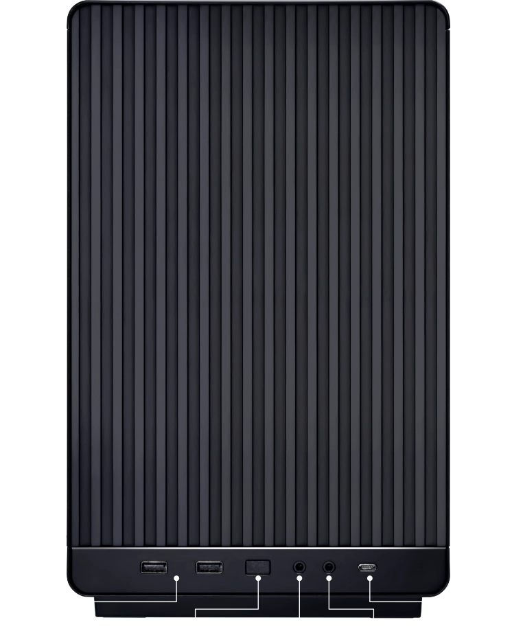 חיבורי ה־IO הקדמיים כוללים את כל הפורטים והכפתורים החיוניים, יחד עם עיצוב חזית נקי ואלגנטי. כך ה־A3-mATX מבטיח לכם חוויית שימוש חלקה ומראה יוקרתי על שולחן העבודה.