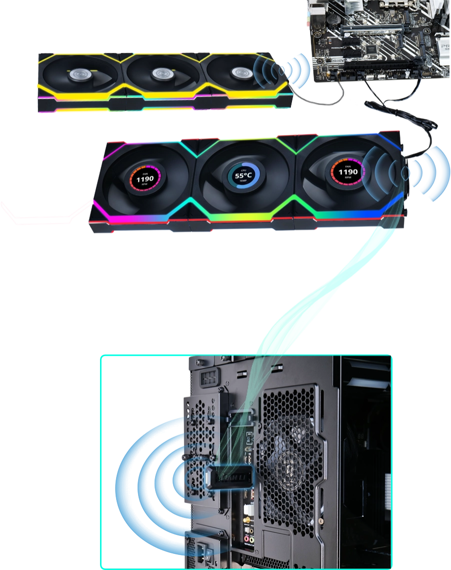 בהתבסס על חוויית משתמש ומחקר מתמשך, עיצבנו מחדש את בקר ה־L-Wireless. בקר זה מתחבר ללוח האם ומשדר אות בתדר 2.4GHz אל המאווררים, ובכך מאפשר שליטה אלחוטית על אפקטי תאורת ה-LED ומהירות סיבוב המאווררים בסדרת UNI FAN SL Wireless.