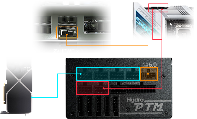 הסדרה כוללת חיבור מקורי ל-PCIe דור 5 ותומכת גם ב-4 חריצים של PCIe 6+2Pin לכרטיסי מסך, בנוסף לשני חיבורי מעבד (CPU) לביצועים גבוהים יותר.