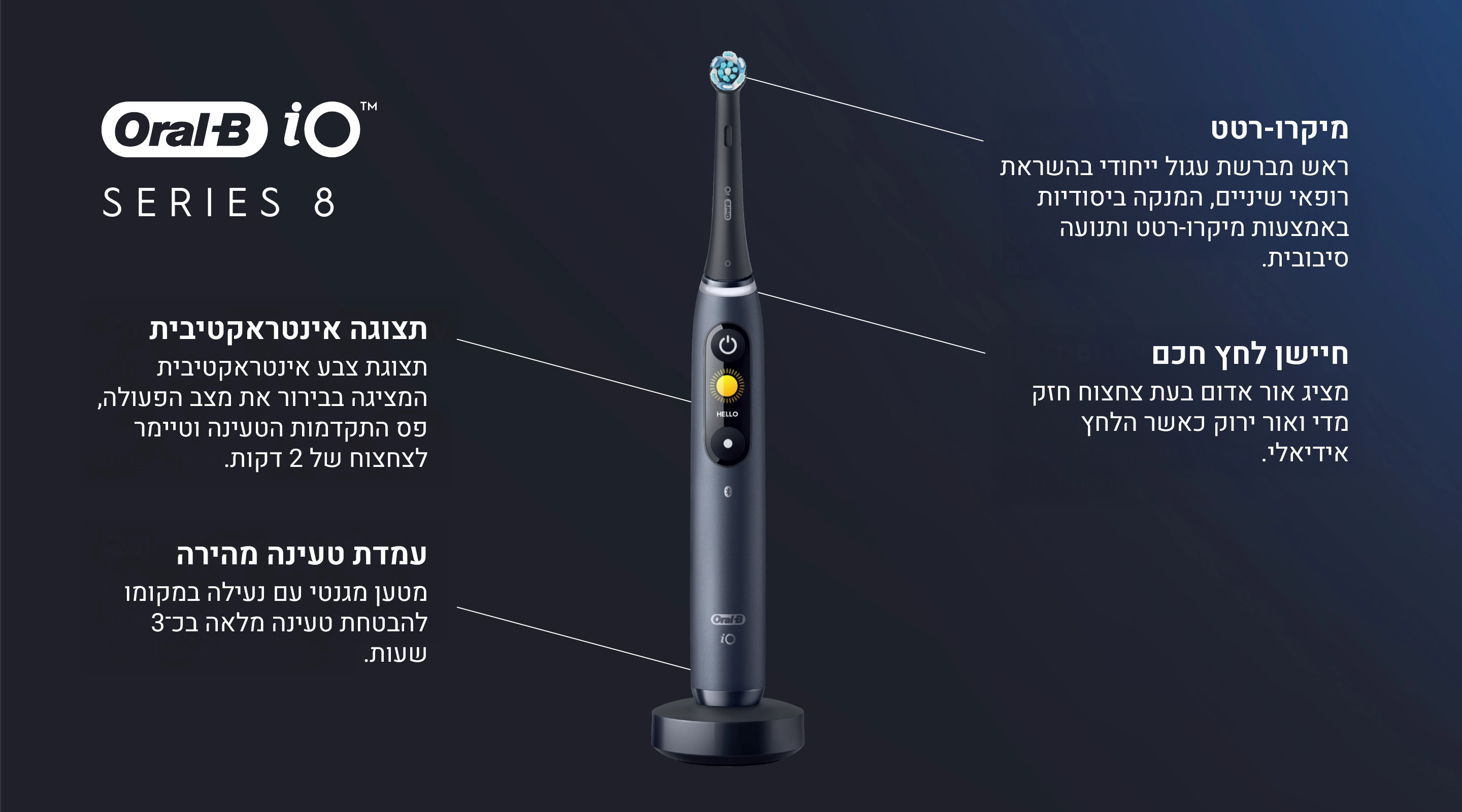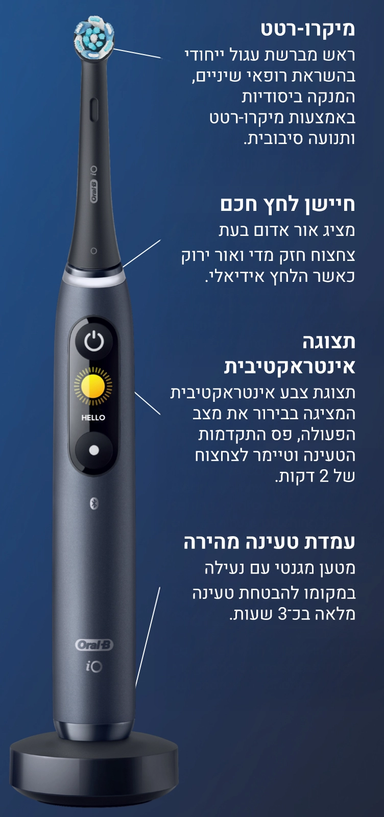 • הגן על החניכיים עם חיישן הלחץ iO, היחיד שמסמן אם אתה מצחצח חזק מדי, חלש מדי או בדיוק נכון לניקוי יעיל ובטוח.