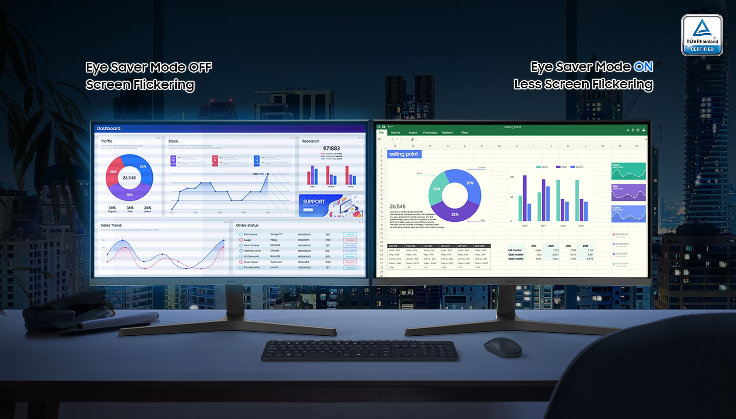שמרו על נוחות העיניים שלכם, גם בשימוש ממושך. טכנולוגיה מתקדמת לשמירה על נוחות העין, בעלת תו תקן של TÜV, מפחיתה עייפות על ידי צמצום אור כחול וריצודים מעיקים במסך.