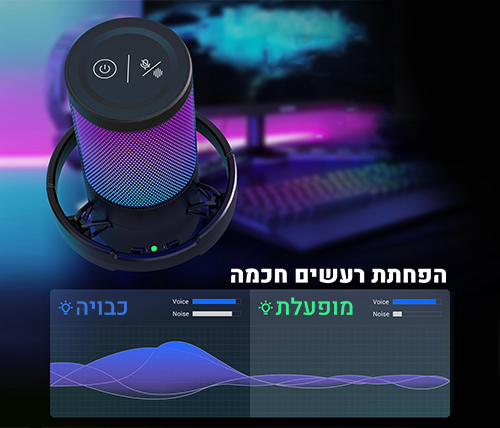 המיקרופון מפחית רעשים סביבתיים באמצעות טכנולוגיית הפחתת רעשים חכמה. לחיצה פשוטה תאפשר לכם לעבור בין מצב שקט למצב הפחתת רעשים, כך שתוכלו להתאים את ההקלטה בקלות לכל סביבה בה אתם נמצאים.