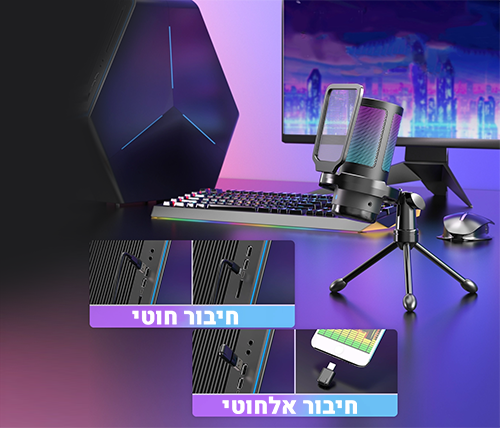 באמצעות חיבור USB אלחוטי, המיקרופון יתאים לשימוש עם מחשבים, סמארטפונים, PS4 ו-PS5 ומבטיח אמינות ובטיחות לשימוש יומיומי לאורך זמן.