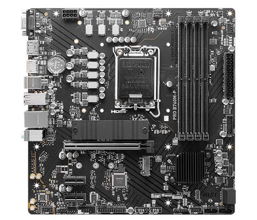 לוח אם למעבד אינטל מבית MSI דגם PRO B760M-P DDR5 ערכת שבבים B760 בעל תושבת 1700 מסוג mATX יציאות HDMI ,DP, VGA חיבורי USB 3.2 USB 2.0 ו- Type - C