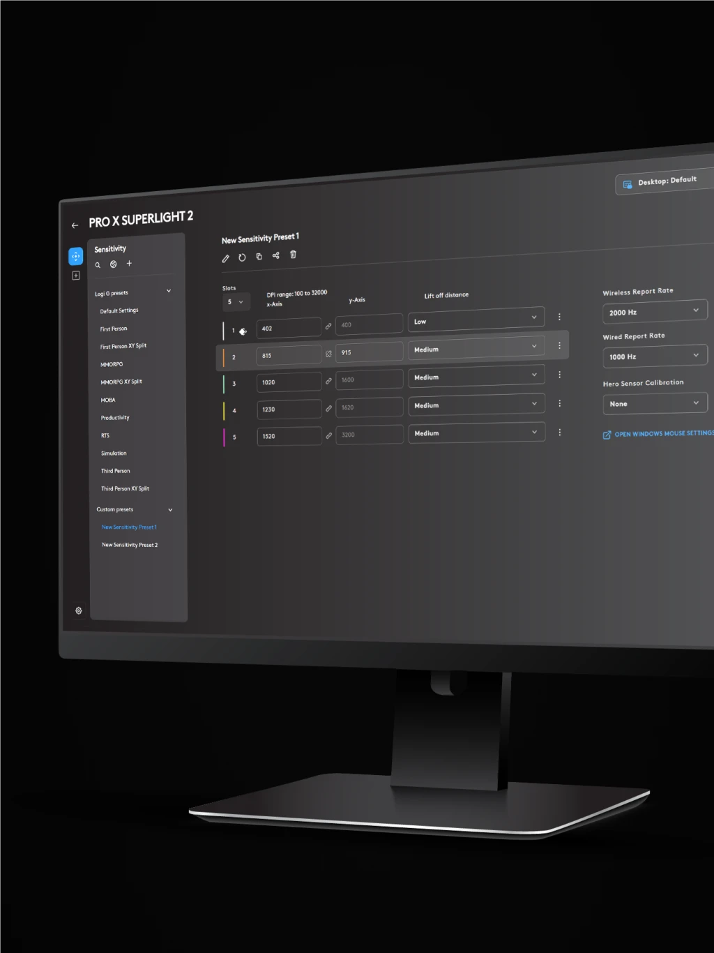 כיול חיישן מדויק מאפשר התאמה עצמאית ומדויקת לצירי X ו-Y, סובלנות הרמה מתכווננת כדי להתאים את האחיזה והתנועה שלך, וקל לסנכרן עם הגדרות הרגישות של עכבר אחר – הכל דרך Logitech G HUB.