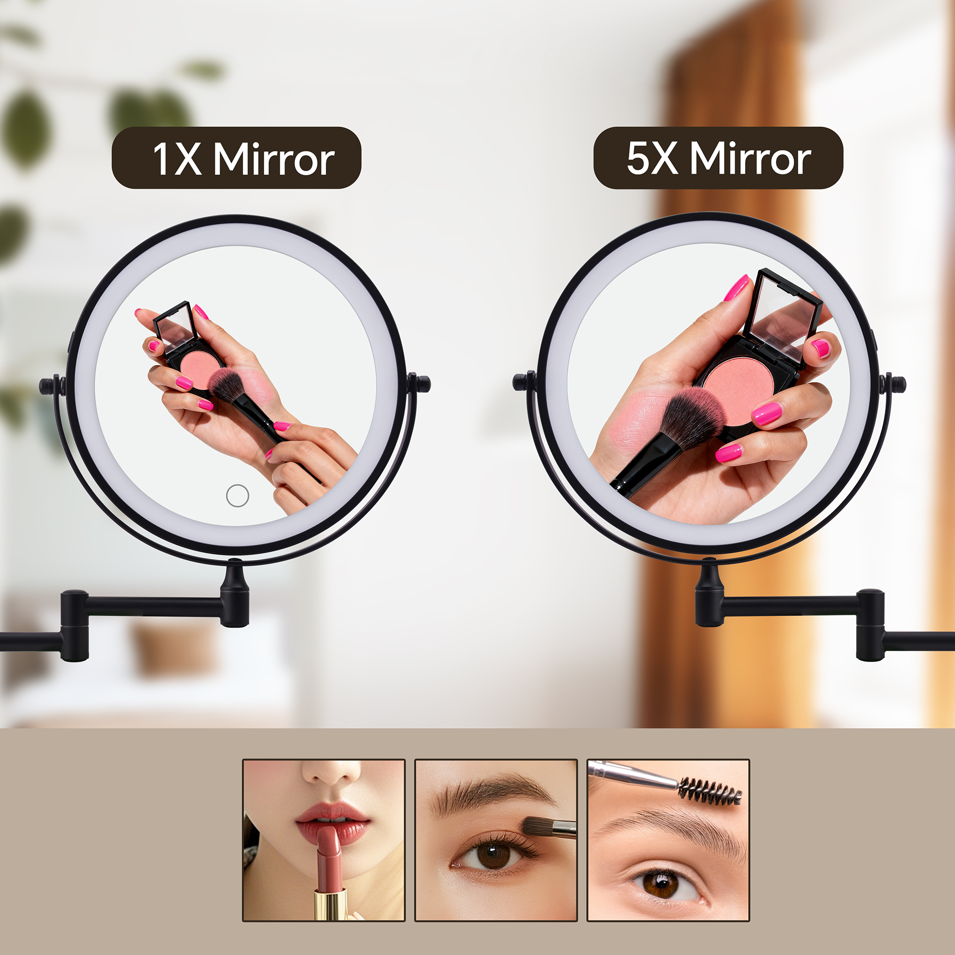 צד המראה הרגיל 1X וצד המגדיל 5X מאפשרים לראות כל פרט קטן בבירור. מבנה הברזל והזכוכית האיכותיים, יחד עם גימור שחור מט יוקרתי, מבטיחים עמידות לאורך זמן ומראה מודרני שמתאים לכל חדר.