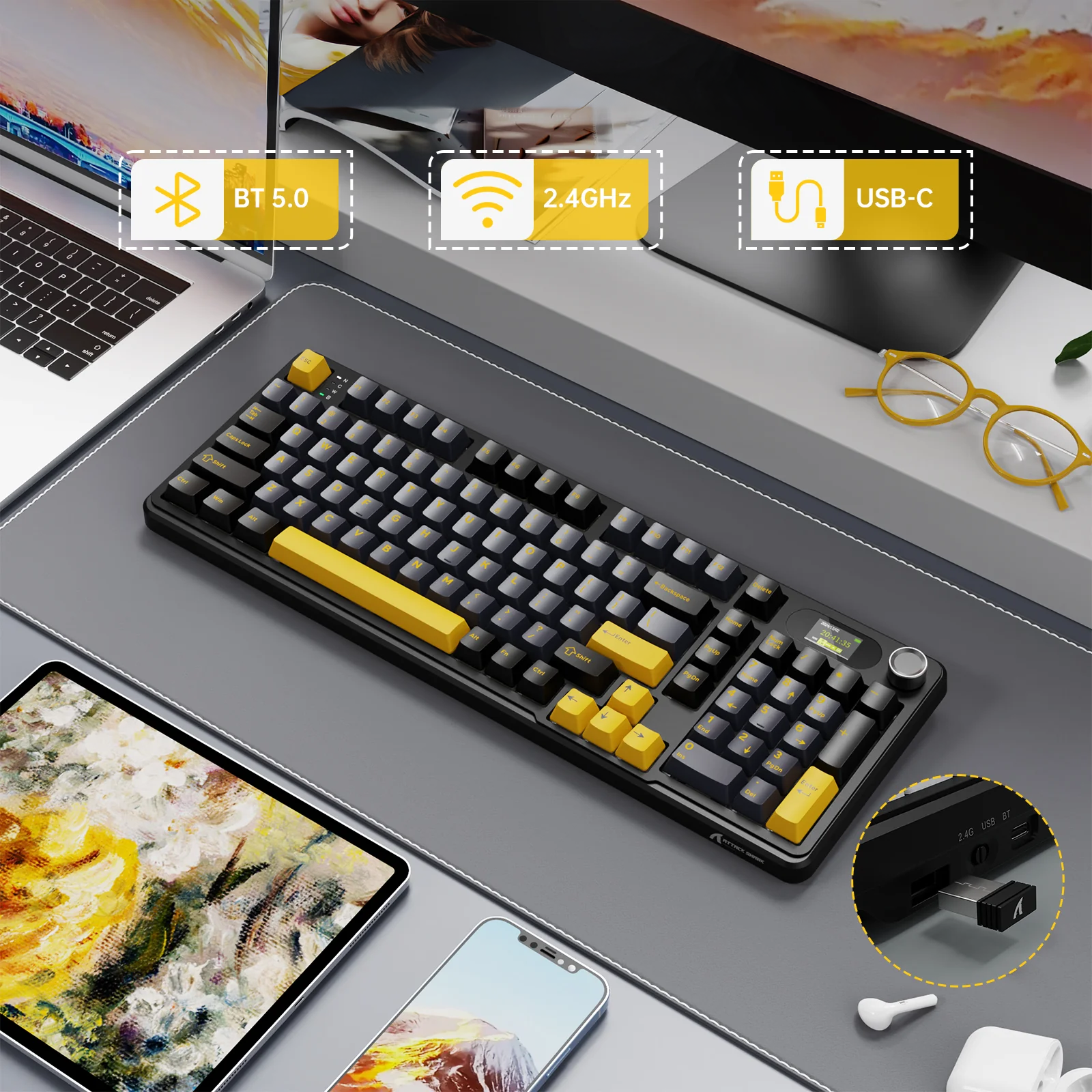 מקלדת X98 Magic כוללת מסך LED מטריציוני ברור ובהיר בגודל 1.5 אינץ’ וחוגת שליטה ניידת ונוחה לשימוש. המסך הקטן מציג מידע חשוב כגון שעה, תאריך ומצב הסוללה. בנוסף, בעת לחיצה על FN יחד עם החוגה, ניתן להשתמש בה להתאמת עוצמת השמע. עיצוב החוגה משלב נוחות ושליטה חכמה בשימוש היומיומי.