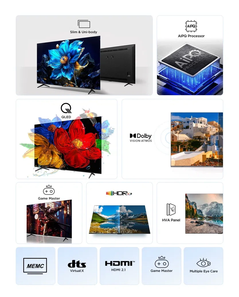 מעבד AiPQ של TCL מבצע עיבוד אלגוריתמי חכם של תוכן ב־4K יציב ואיכותי, לצד טכנולוגיית האצת משחקים לחוויית גיימינג חלקה.
