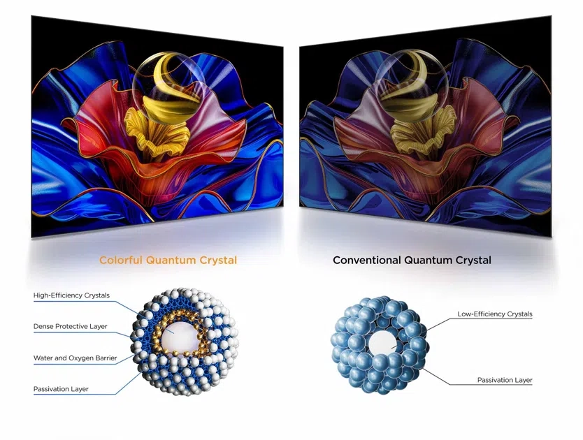 טכנולוגיית TCL QLED עושה שימוש ב־Crystal Quantum צבעוני, המשלב חומרים אורגניים עם חומרים בקנה מידה ננו במספר שכבות. יחד עם טכנולוגיית תאורה אחורית מתקדמת, מתקבלת פריצת דרך המאפשרת ביצועים אופטיים וצבעים יוצאי דופן. כל פריים מציג במיומנות יותר ממיליארד גוונים חיים ומדויקים, עם בהירות משופרת החושפת פרטים עדינים לחוויית צפייה סוחפת ומציאותית.