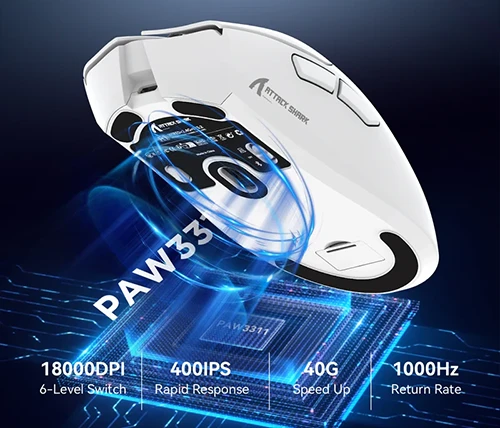 עכבר גיימינג אלחוטי Attack Shark R1 – קל משקל 59 גרם, חיישן 18000DPI, חיבור תלת-מצבי וביצועים מדויקים - צבע לבן