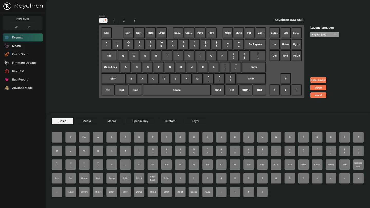 ל-B33 מתג מערכת למעבר בין Windows ל-macOS, ואף ניתן להגדיר פריסות מקשים שונות לכל מערכת. אפליקציית Keychron Launcher תואמת ל-macOS, Windows ו-Linux.