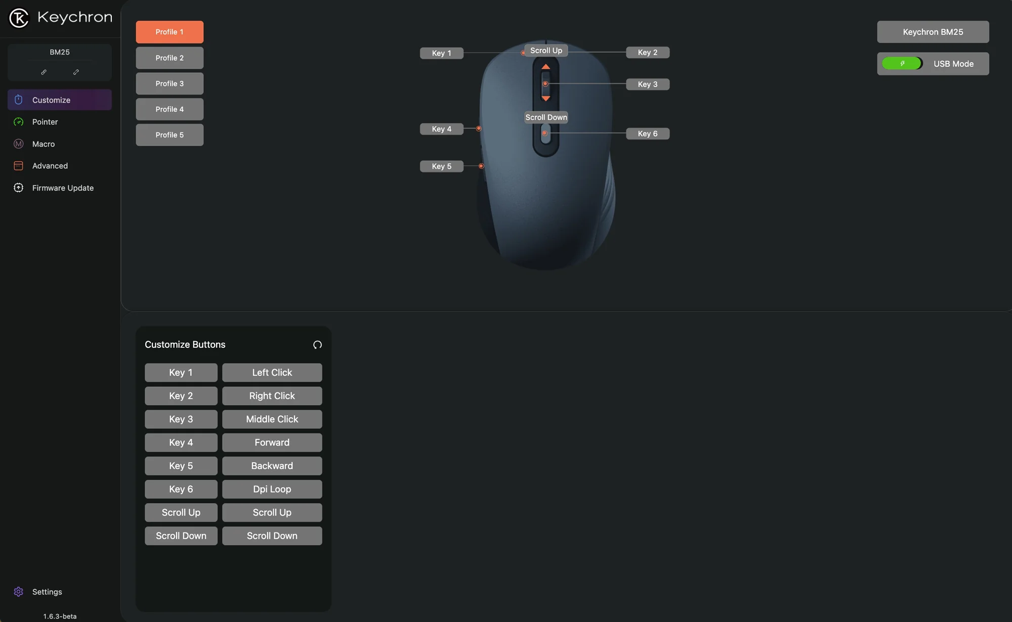 פתחו אפשרויות התאמה בלתי מוגבלות באמצעות אפליקציית הרשת Keychron Launcher: מיפוי מקשים, מאקרו, קיצורים ועוד. בנוסף, תוכלו להגדיר הגדרות מתקדמות לעכבר כמו קצב דגימה (Polling Rate) ו-DPI. המערכת כוללת 5 פרופילים פנימיים לשימוש עם יישומים או מחשבים שונים.