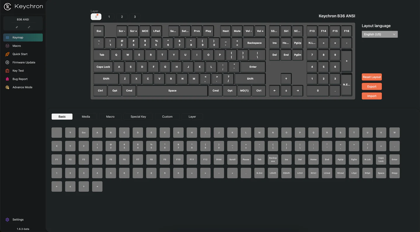 ל-B36 מתג מערכת למעבר בין Windows ל-macOS, ואף ניתן להגדיר פריסות מקשים שונות לכל מערכת. אפליקציית Keychron Launcher תואמת ל-macOS, Windows ו-Linux.