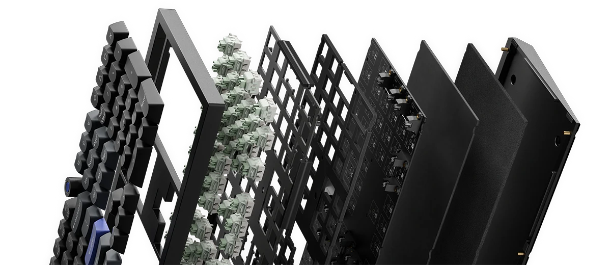 עיצוב ה-Double-Gasket הוא מבנה חדשני בתעשייה. מעבר לאטמים שעל הפלטות, הוספנו רפידות סיליקון בין החלק העליון לתחתון של המארז, להפחתה משמעותית של תהודת רעש בין המתכות — לחוויית הקלדה איכותית ומעודנת יותר.
