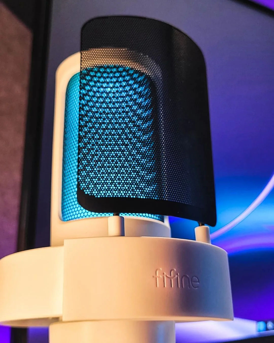 הפילטר הפופ שקוף וללא מסגרת, עם לוגו מחייך של FIFINE. העיצוב הקמור הקטן מפחית את הנוכחות הפיזית שלו עוד יותר. מבחינת מראה, הוא מחליף את הפילטרים המגושמים והמטרידים. אך לא מדובר רק באסתטיקה – צפיפות הרשת הפלסטית מספיקה כדי למנוע מהאוויר לפגוע ישירות במיקרופון.