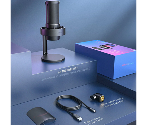 כבר מהקופסה מגיעים המיקרופון ותושבת בולמת הזעזועים כשהם מורכבים מראש. בניגוד לתושבות מסורתיות שמוברגות לתחתית המיקרופון באמצעות אום, התושבת של ה-AmpliGame A8 מחוברת באמצעות גומיות אלסטיות. כך היא יעילה יותר במניעת מעבר של רעידות לא רצויות אל תוך הסטרים או ההקלטה שלכם.
