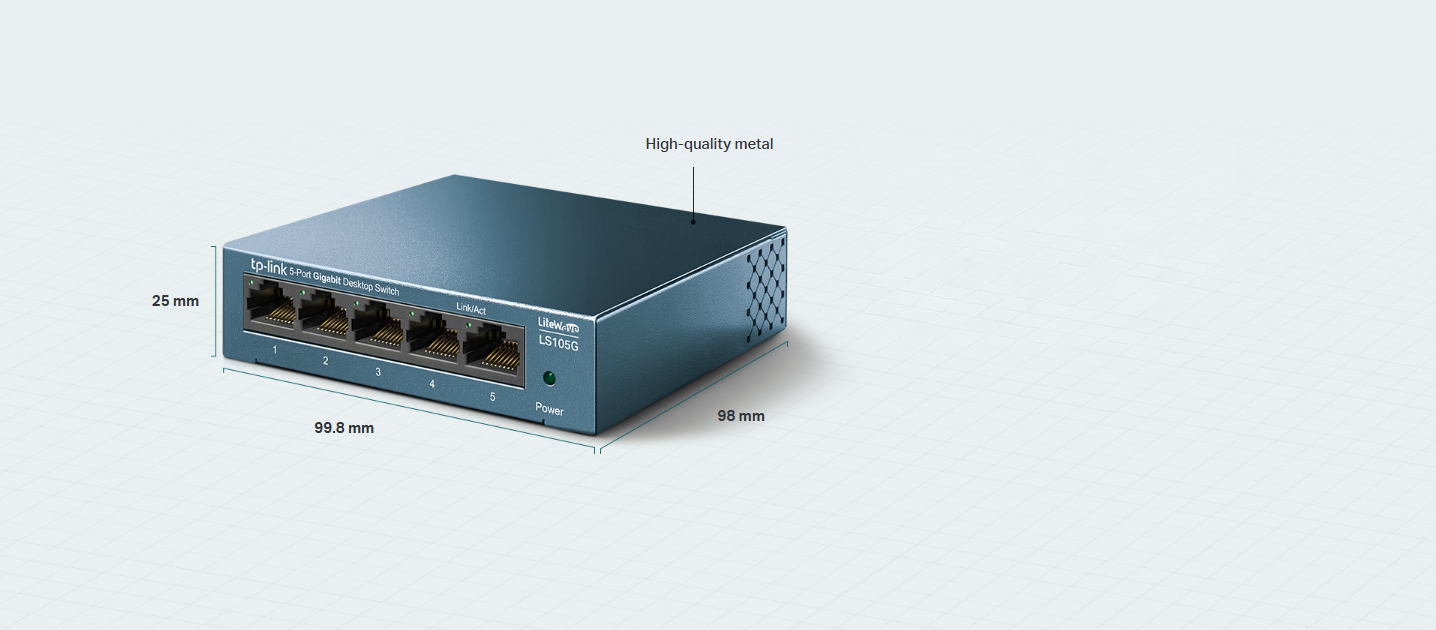 הרכיבים הפנימיים של LS105G מוגנים באמצעות מארז מתכת איכותי המבטיח אורך חיים ארוך. לאחר שעבר שורת בדיקות אמינות קפדניות, המתג מספק ביצועי מיתוג יציבים שניתן לסמוך עליהם. הגודל הקומפקטי הופך אותו לאידאלי לשימוש על שולחן עבודה או משטחי עבודה.