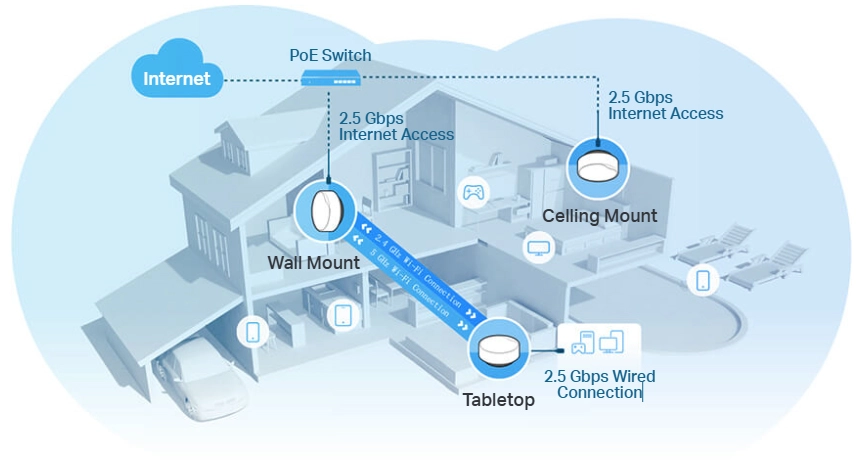 ה-Deco X50-PoE מציע התקנה גמישה המתאימה למגוון צרכי שימוש. ניתן להציב אותו על שולחן או להתקין אותו על תקרה או קיר בעזרת האביזרים הייעודיים שלנו.