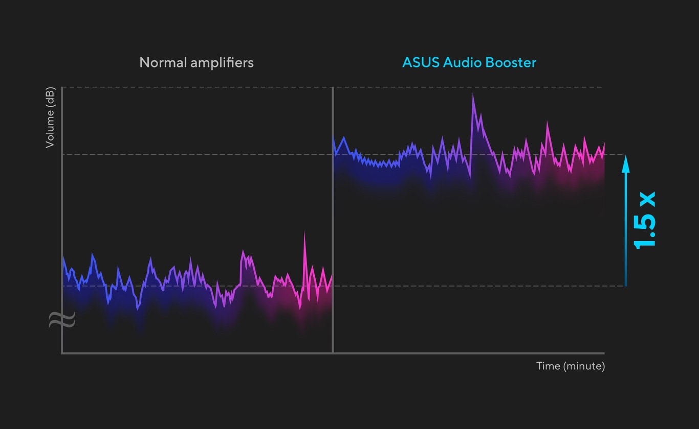 טכנולוגיית ASUS Audio Booster עושה שימוש באלגוריתמים ייחודיים להגברת עוצמת השמע עד פי 1.5, ומביאה את חוויית ההאזנה שלכם לשלב הבא.