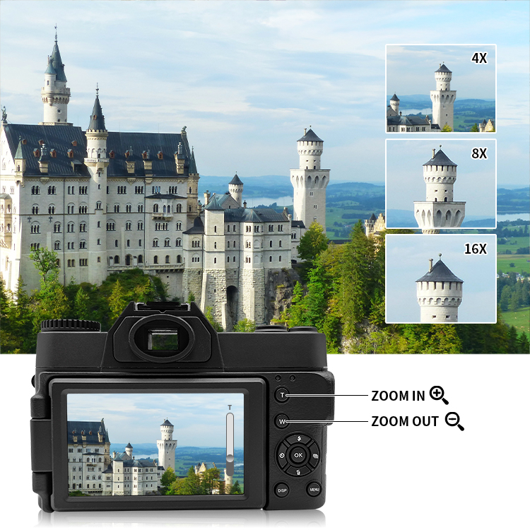 המצלמה מצוידת בזום דיגיטלי עוצמתי של 16X, המאפשר להתקרב לאובייקטים רחוקים ולהבליט פרטים חשובים בלי להתקרב פיזית. הזום משפר את יכולת הצילום במגוון מצבים – מטיולים ונופים ועד לאירועים ותקריבים – ומעניק גמישות ויצירתיות בכל צילום.