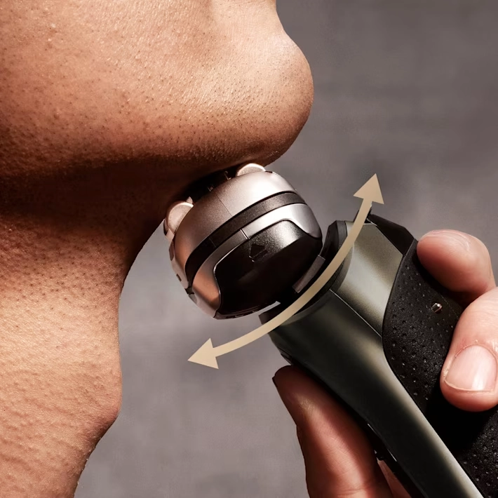 ראש גילוח גמיש בזווית 40° מתאים את עצמו לקווי הפנים ומגיע גם לאזורים הקשים לגילוח כמו מתחת לסנטר והצוואר.