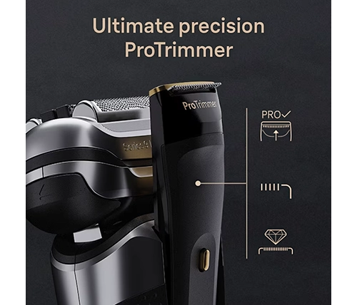 קוצץ הדיוק המובנה ProTrimmer, עם פלדת נירוסטה בדרגת ניתוחים, מבטיח חיתוך מדויק ויעיל גם בשפם, בפאות ומתחת לאף.