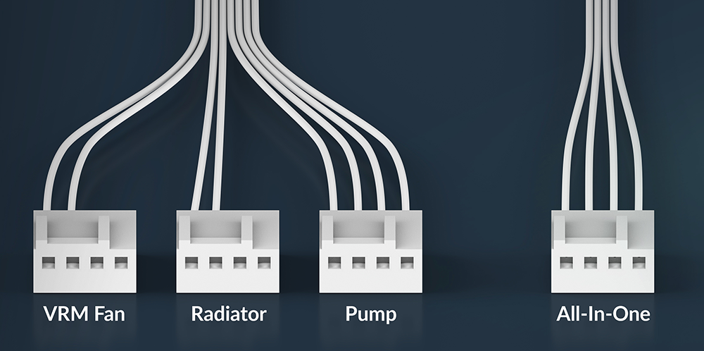 באמצעות כבל מפצל ניתן לשלוט בנפרד על המשאבה, מאוורר ה-VRM והמאווררים של הרדיאטור, או לסנכרן את כולם עם אות PWM יחיד באמצעות כבל All-in-One.