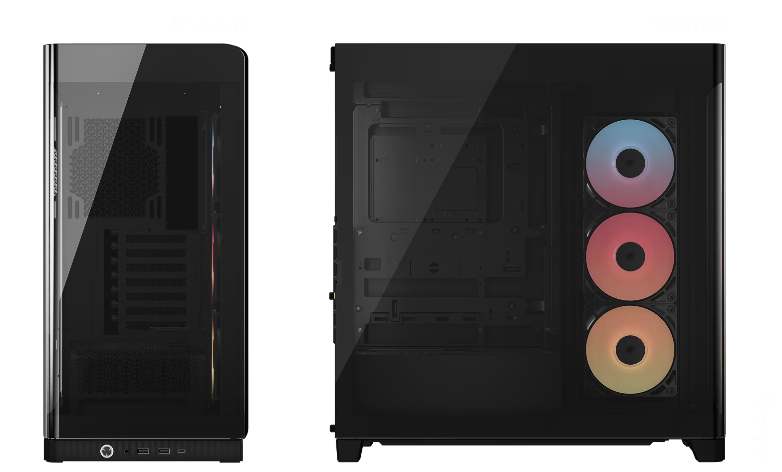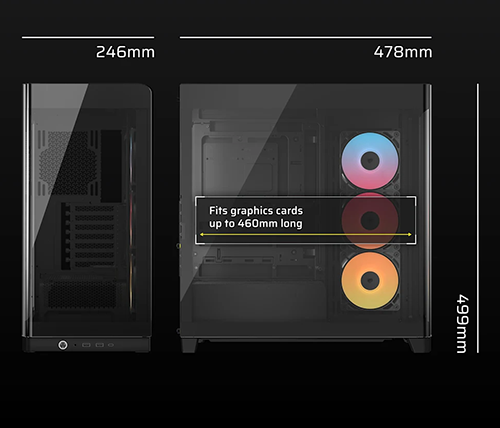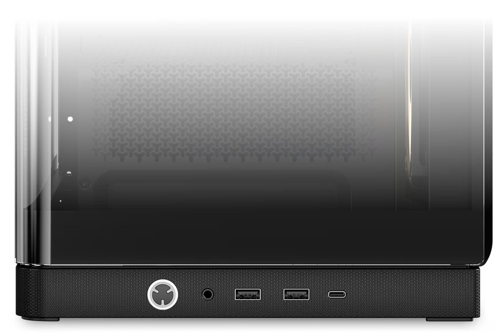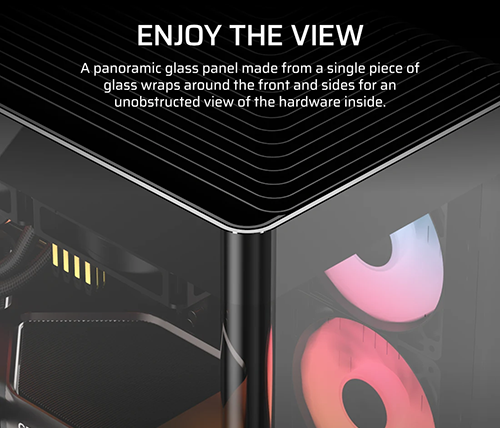 חתיכת זכוכית מחוסמת אחת, מעוגלת, מאפשרת לכם להציג את המערכת שלכם ללא הפרעה – ללא תפרים או זוויות חדות שמסתירות את הנוף. הזכוכית המעוגלת מקיפה את החזית והצד, ומספקת מבט בלתי מופרע אל החומרה החזקה שלכם.