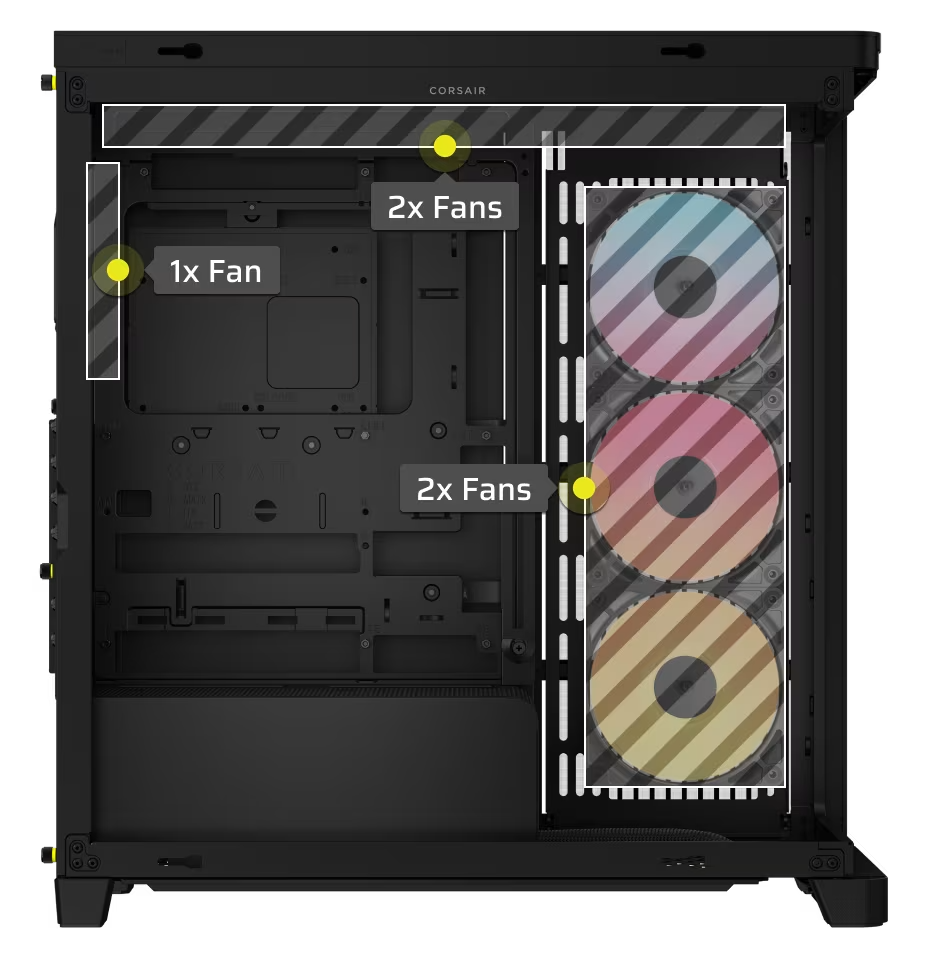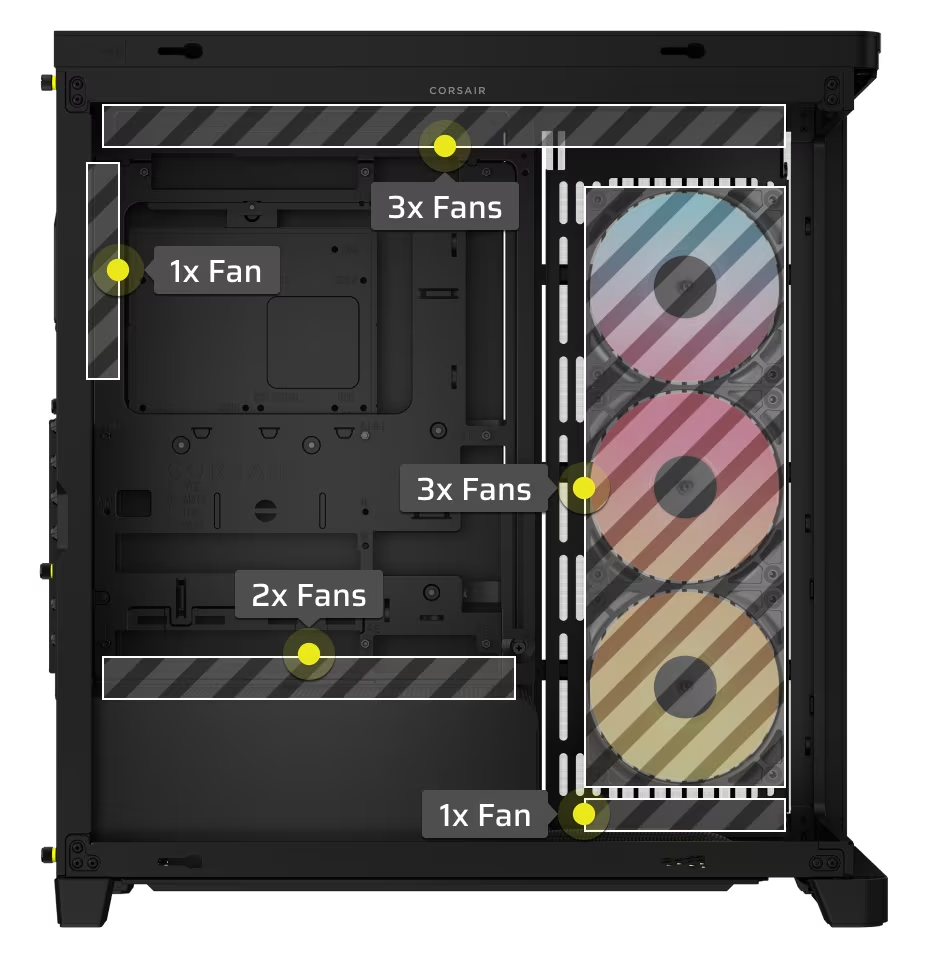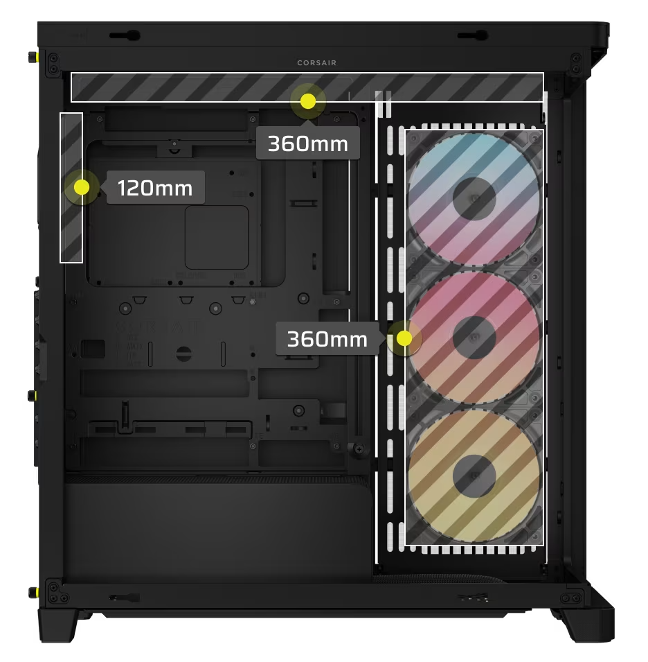 התאימו אישית את מערך הקירור שלכם עם מקום לעד 10 מאווררי 120 מ"מ, יחד עם אפשרויות התקנת רדיאטורים מגוונות, כולל עד שני רדיאטורים של 360 מ"מ בו־זמנית.