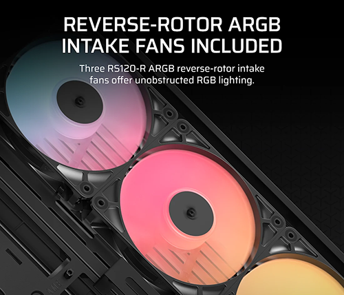 מאווררי ARGB PWM RS-R עם רוטור הפוך כלולים לקבלת תאורת RGB בלתי מופרעת וקירור שקט. אוויר צח נשאב דרך הצד המאורר אל תוך מארז ה-MID-TOWER המרווח, לקירור יעיל וזרימת אוויר שופעת שתשמור על ביצועים מקסימליים.