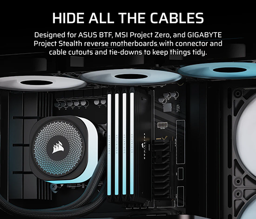 תואם במלואו ל-ASUS BTF, MSI Project Zero ו-GIGABYTE Project Stealth. העיצוב כולל פתחים ייעודיים וקצוות למתחברים ולכבלים, יחד עם נקודות קשירה, כדי לשמור על המערכת שלכם מסודרת — גם באזורים שאינכם רואים.