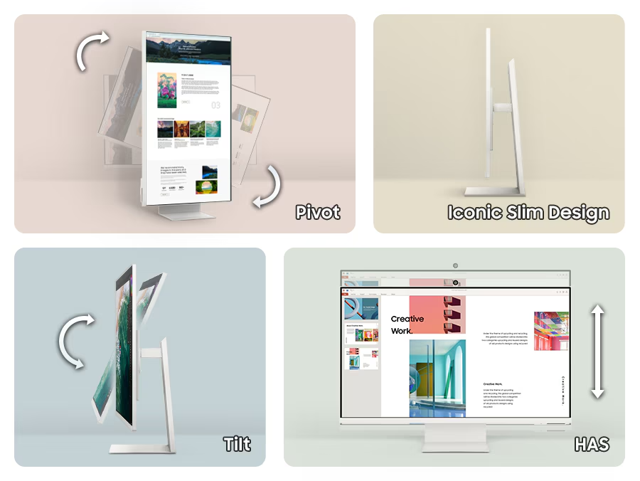 שדרגו את סביבת העבודה שלכם עם Smart Monitor, שמשלב מראה אלגנטי ונוחות. המעמד המתכוונן שלו מאפשר להטות ולסובב את המסך, ולשנות את הגובה שלו ללא מאמץ. כך ניתן לצפות במסמכים ארוכים ולגלול פחות.