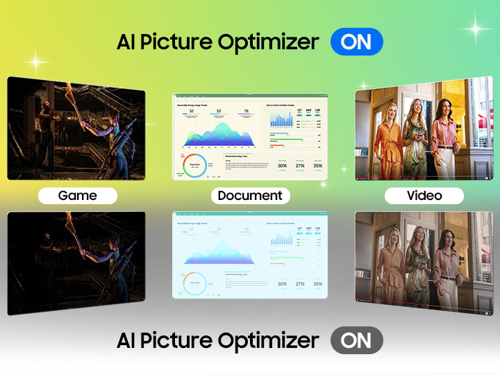 יכות תמונה אופטימלית שמותאמת לצרכים שלכם. AI Picture Optimizer מתאים את התצוגה כדי לסייע לכם לעבוד על מסמכים בנוחות, להיסחף לתוך המשחקים עם גווני שחור עמוקים ועשירים, ולצפות בסרטונים עם צבעים מלאי חיים.