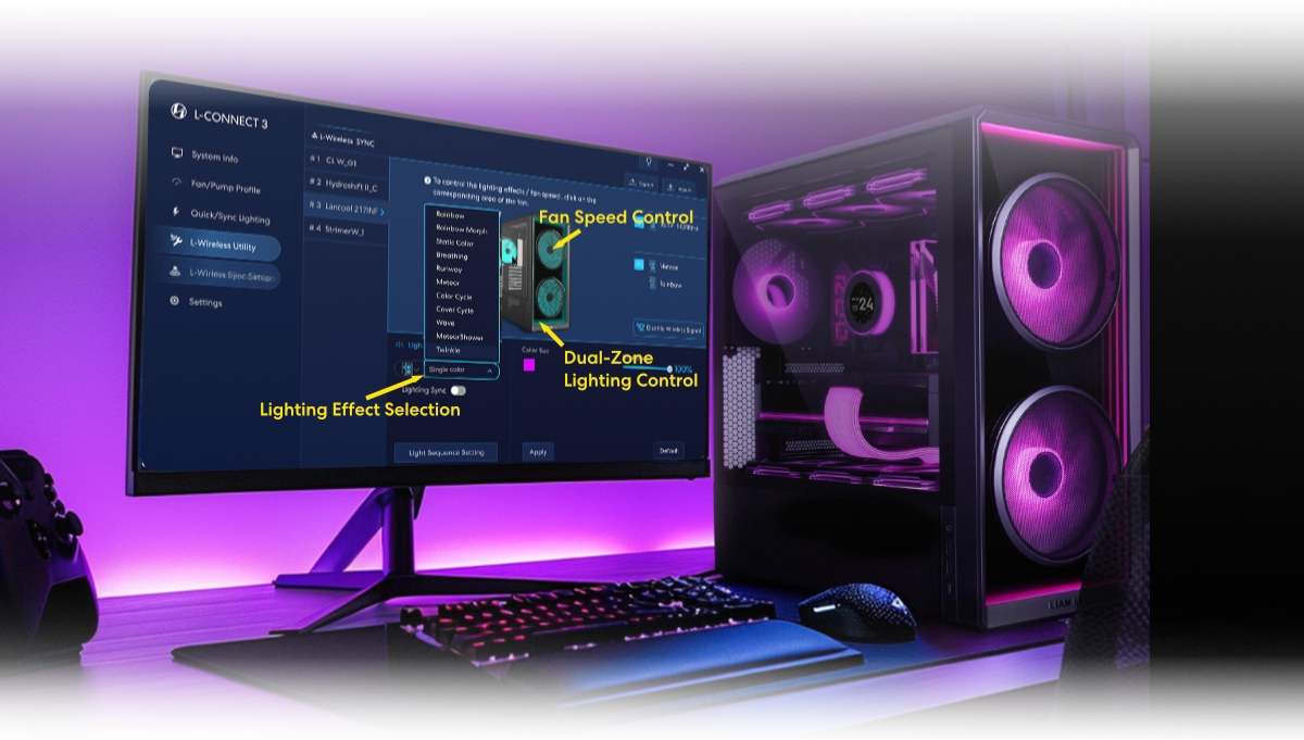 לאחר מעבר למצב אלחוטי, תוכלו להתאים אפקטי תאורה ומהירויות מאווררים דרך L-Connect 3 וליצור מערכת אלחוטית חלקה. השליטה הדו-אזורית מאפשרת לכם לכוון את תאורת המאווררים ואת מראת האינסוף יחד או בנפרד — להתאמה אישית מלאה.