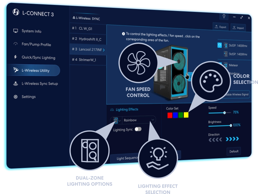 במצב ברירת מחדל, מאווררי 170 מ״מ ו-140 מ״מ עובדים בסנכרון PWM עם לוח האם. במצב אלחוטי, L-Connect 3 מאפשר שליטה עצמאית במהירות ובתאורה להתאמה מדויקת.