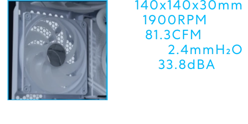 בחלק האחורי יש מאוורר 140 מ״מ (עובי 30 מ״מ) שמפנה חום ביעילות ושומר על זרימת אוויר יציבה וטמפרטורה אופטימלית.