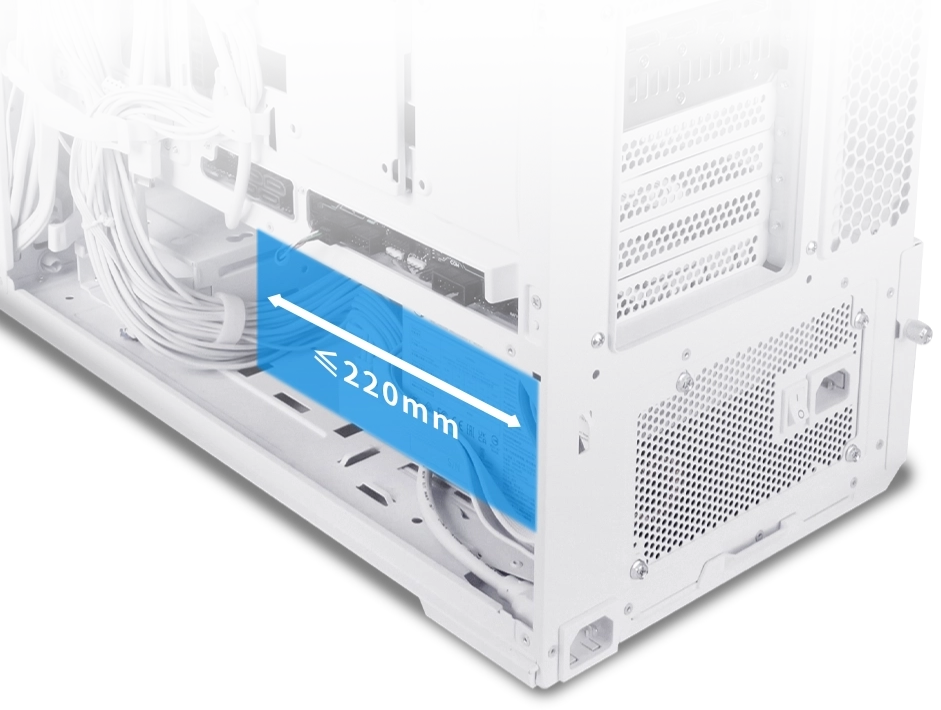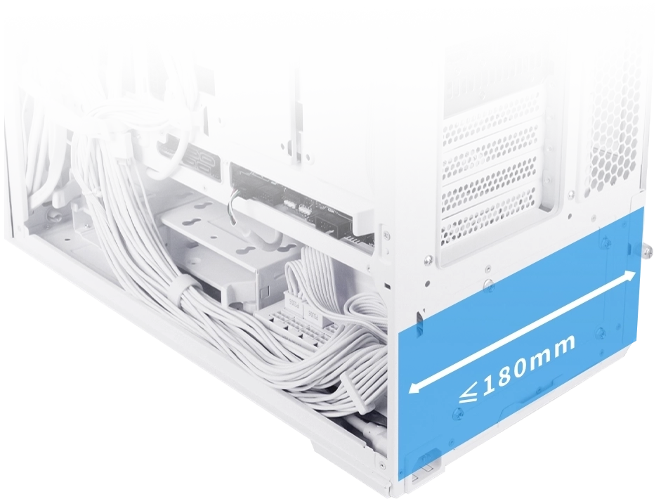 כאשר הספק מסובב ב-90° והמחברים פונים ימינה, יש תמיכה בספק קומפקטי באורך של עד 180 מ״מ. כך מתקבל מרחב טוב יותר לניהול כבלים, והמאוורר יכול לקרר ישירות את הספק לשיפור יעילות הקירור. בנוסף, תוכלו להעביר את שני המאווררים התחתונים מתחת לתושבת למראה נקי ומוסתר יותר.