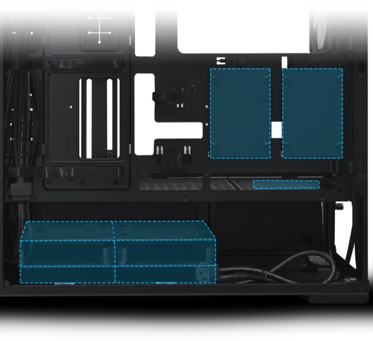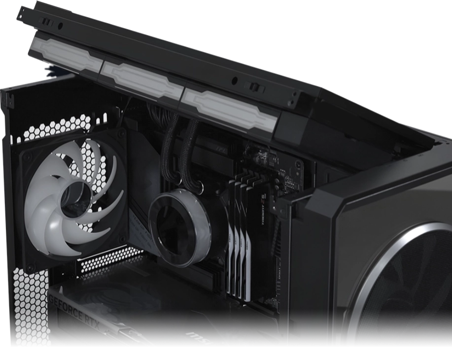 ניתן לסובב את תושבת חריצי ה-PCIe ב-90° כדי לתמוך בהתקנה אנכית של כרטיס מסך (Vertical GPU). במקרה כזה תוכלו להעביר את המאוורר התחתון מתחת לכיסוי הספק לקבלת מראה נסתר ונקי יותר — עם גמישות גבוהה בהרכבה.
